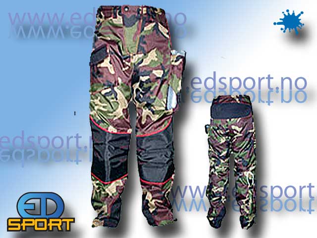 Behagelig spillebukse. God passform med spesielle lommer for ballholder (pod) og løpsrenser. Forsterkninger i kne, og linning. Kommer i stilig woodland kamuflasje mønster.