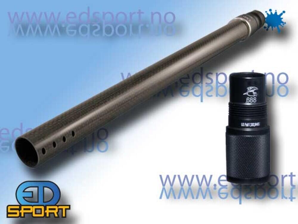 Hammerhead Scenario MoFo 14″ karbonfiberløp T98Karbonfiber løp for markører med Tippmann 98 gjenger. Kommer med bakstykke som har bore .688. Reversert porting på framstykke minimerer lyd framover. Spiralformet for presis ballbane og økt skuddlengde