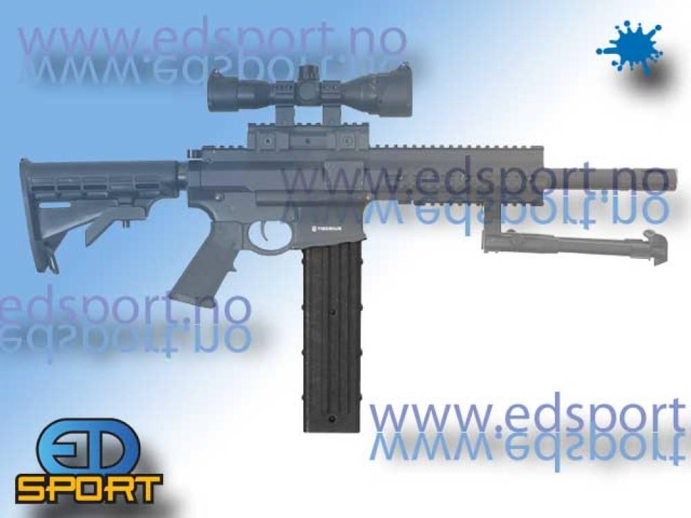 Original magasin for T4 med tilkopling til remoteslangeDetaljer for T4:Kommer med:- Klargjort for bruk av «First Strike» ballen- Innskyvbar AR 15/M4 kolbe- 4 x 32 kikkertsikte- Lavprofil bi-pod- Godt med muligheter for railinnfestning av diverse ekstrautstyr- 2 stk 14 skudds magasin- Remote adapter- Standard magasin adapter- Koffert for oppbevaring av hele markøren- Nødvendig verktøy- ManualDette er Paintball markør for sanne senario spillere.»……. I am not going to write a long story about every feature. Other sites do a great job tearing it all down. This gun is simply bad ass. You can use Co2s or have a remote. I have tried both and I like using the 12 gram power jets a bit more. I also like to use the scope to see far away I feel like it is almost an unfair advantage. This gun changes the game. I love it. It has some weight to it making it feel like quality. No batteries either Made in the USA is so rare these days. This one is.Now dont try this at home but think about it if your at home and something happens this bad boy can double as a less than lethal option. Just load it up and turn up the velocity. It makes a great less than lethal option that I am not endorsing but just want you to think about. It is scary as hell to have one pointed at you. So what is the price? Way under a grand Some think the price is a little high but I do not. For all that you get I think it is a better deal than so many of the guns it is being compared to.If you want to see a quick clip of the one we have visit this link. It was taken at D-Day 2009 right in front of our dead Alamo rent-a-car. Click here to view the videoVisit their website to learn more or next time you see some LA Hitmen ask to check it out. We like to take it everywhere we go. Tiberius Arms T4 is a kick-ass product for a player who can afford it. For those who have to run from it good luck……»http://www.teamlahitmen.com/archives/1406Begrenset avtalerabatt på dette produktet