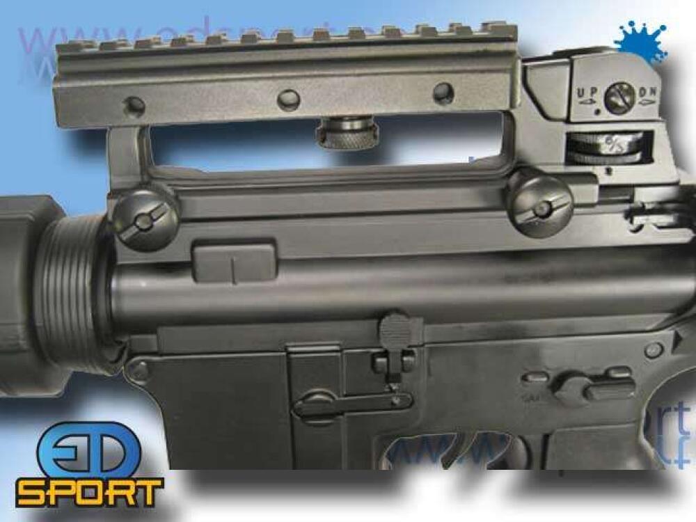 En vanvittig skinne som lar deg topp- eller sidemontere utstyr. Eller en kombinasjon av topp / side høyre / venstre.Passer til Colt sine bærehåndtak slik at kan ha rail på toppen av denne.