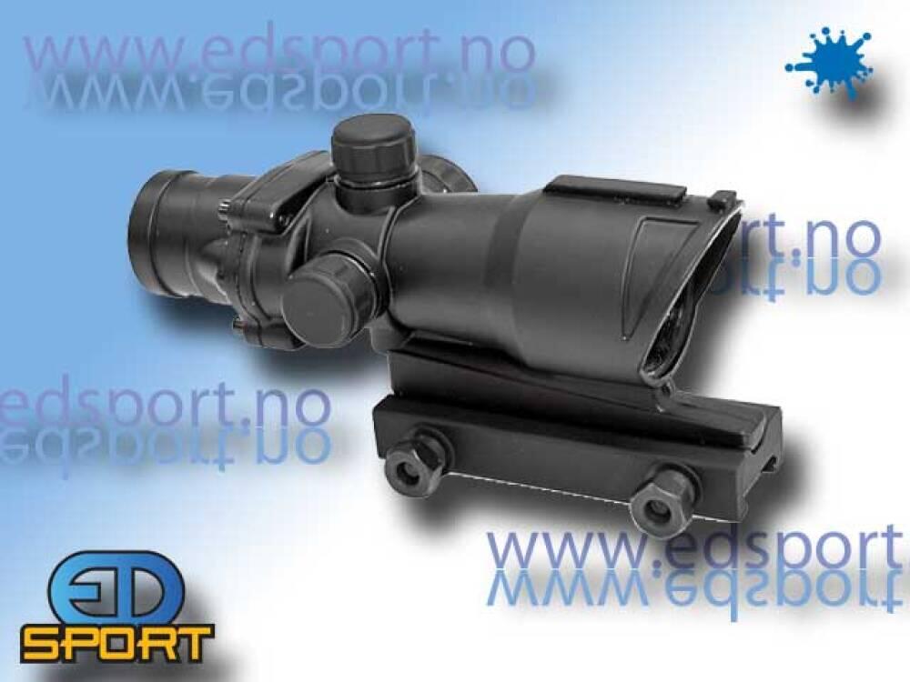 Rødpunktsikte med «cap» på front linsen. Støpt i en gummiert form for gi optimal beskyttelse mot regn og fuktighet. Fastmontert på Mount rail gjør at den bygger godt opp i høyde
