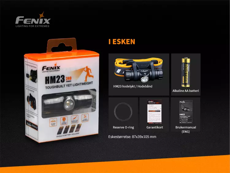 Fenix HM23 er en kompakt og lett hodelykt. Lykten er produsert i aluminium og veier kun 43 gram.