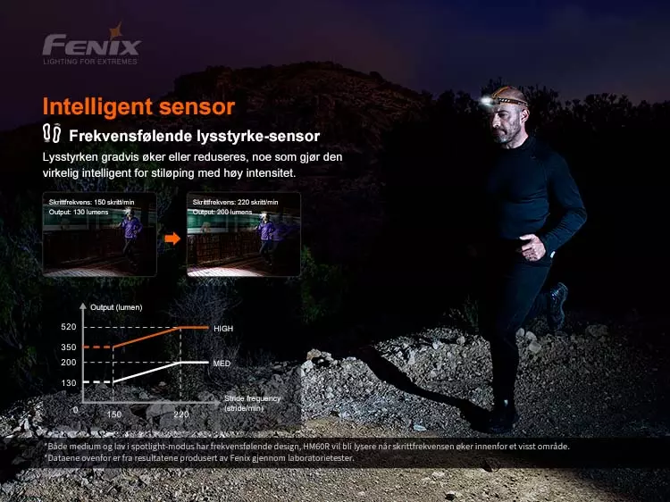 Med den frekvensfølende lysstyrke-sensoren kan hodelykten automatisk endre lysstyrken for å tilpasse seg ulike aktiviteter. Etter hvert som brukerens skrittfrekvens øker eller reduseres vil lysstyrken gradvis øke eller reduseres tilsvarende noe som gjør den virkelig intelligent for stiløping med høy intensitet.