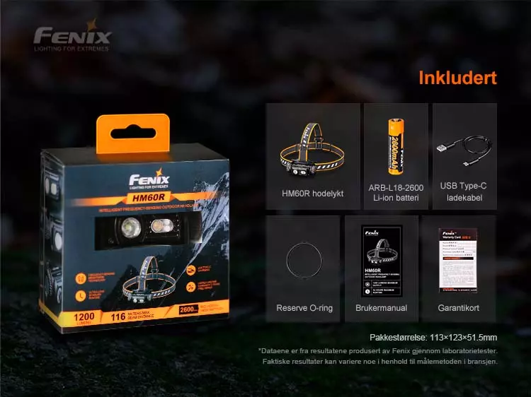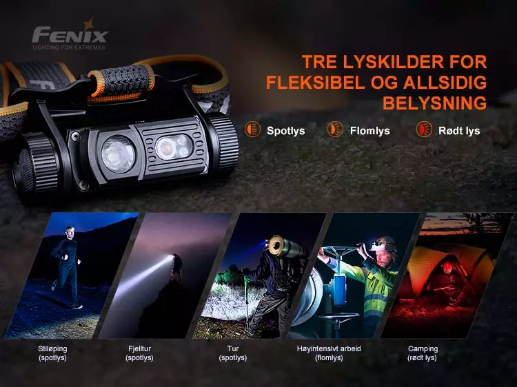 Fenix HM60R er en intelligent utendørs hodelykt som gir lang driftstid. Med spot- og flomlys er hodelykten utmerket både til langdistanse- og vidvinkelbelysning. Har både hvitt og rødt lys.