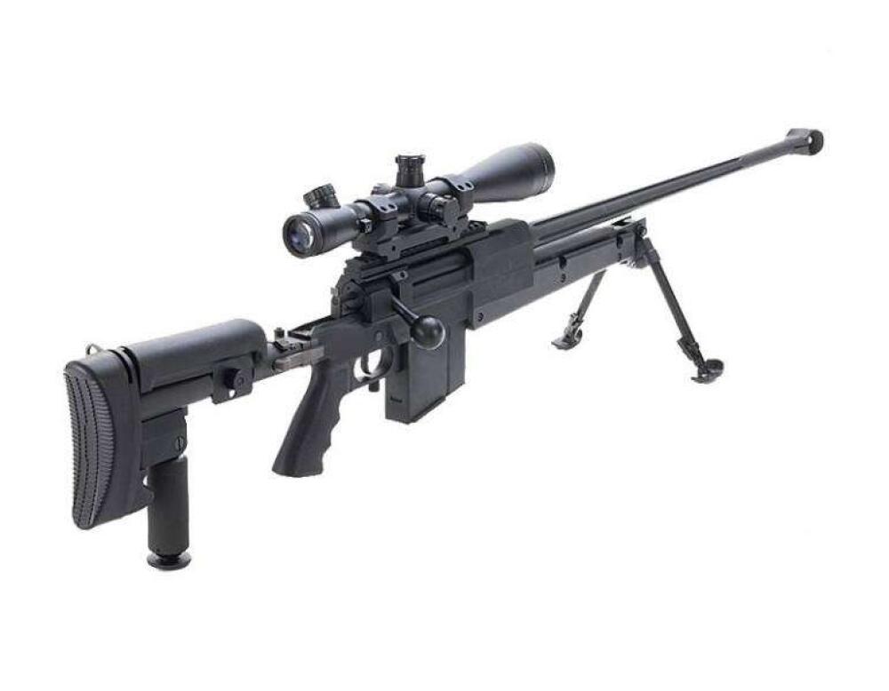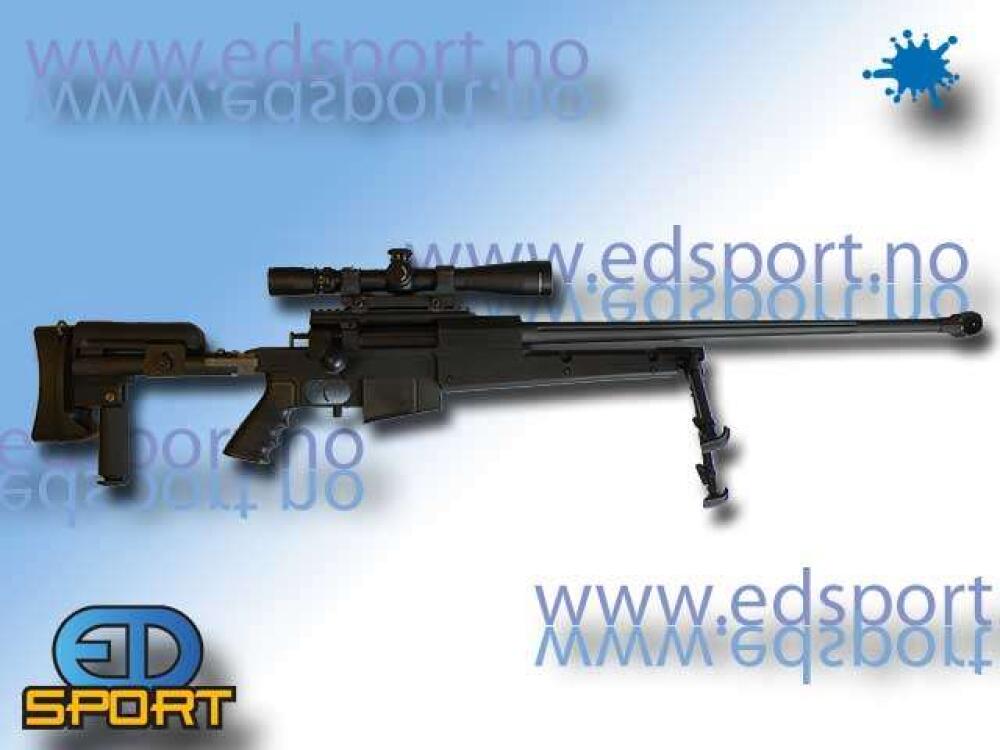 Bolt Action single rifle med følgende utstyr: – 35-10 X 40mm. kikkertsikte Zoom – Støttebein foran og bak – Justering for kinnbein på kolbe. – Alle originale bevegelige deler i funksjon – Sammenfoldbar kolbe – Mesteparten av all aluminium i CNC standard – Enkel å oppgradere til ekstrem høy FPS Utgangshastighet: 500 FPS Magasin kapasitet: 23 kuler Matriale: Aluminium CNC og Nylon Lengde: 1010 – 1230mm. Vekt: 68 kg. Utgangshastightet: 350 – 380 FPS Hop-Up justerbar funksjon Produsent: ARES
