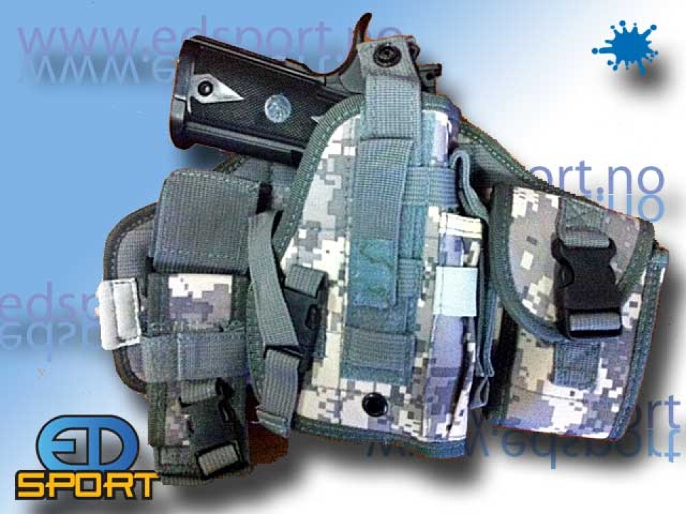 Pistolhylster med flrer praktiske detaljer. Egen lomme for magasin og egen lomme for diverse utstyr. for paintballpistol. Gode innfestningsmuligheter for Hofte / lårmontasje. Lett å tilpasse. Kamomønster – Digi Urban.